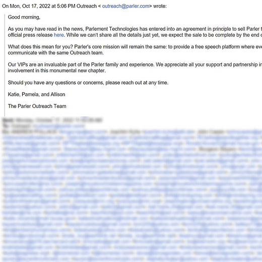 Parlor leak: Woorkweek CEO Adam Ryan revealed this week that right-wing social media site Parler accidentally revealed the personal email addresses of more than 300 of its verified users in a marketing email this week. This is your typical case of confusing CC and BCC fields.