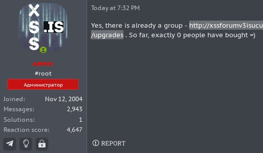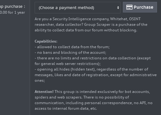 XSS adds section for security firms: Probably tired after having his site scraped over and over again by security firms and malware researchers, the operator of the XSS cybercrime forum decided this week to add the ability for security firms to purchase a "scraper" option to allow them to collect data from the forum without getting blocked or banned.